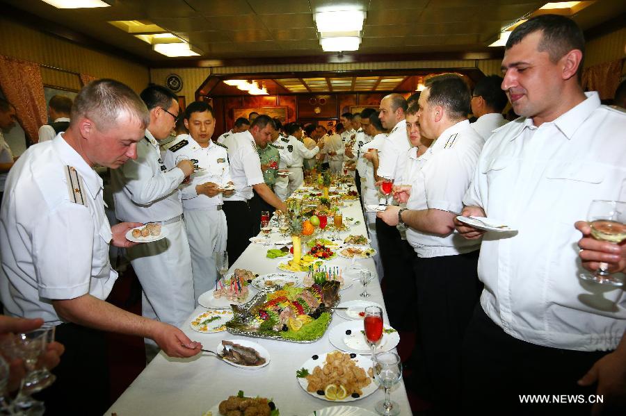 Chinese and Russian officers and soldiers are seen at a buffet during a reception held on the Russian guided missile cruiser Varyag in Shanghai, east China, May 19, 2014. Chinese and Russian naval forces held interchange activities on Monday to enhance mutual communication. (Xinhua/Zha Chunming)