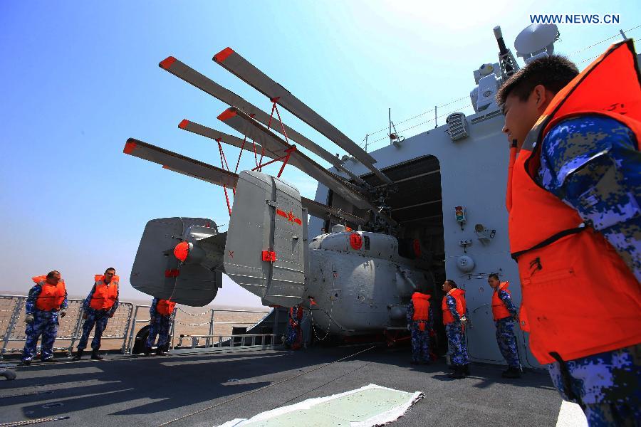 A helicopter enters a hangar on China's Zhengzhou missile destroyer, East China Sea, May 22, 2014. Naval ships from China and Russia left Shanghai for the East China Sea to take part in the "Joint Sea-2014" exercise on Thursday. (Xinhua/Zha Chunming) |
