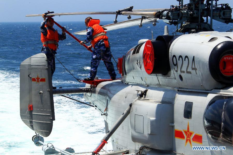Chinese navy soldiers work on a helicopter before sending it into hangar on China's Zhengzhou missile destroyer during the China-Russia joint naval drill on East China Sea, May 24, 2014. The three-day drill "Joint Sea-2014" ended successfully on Saturday. The Chinese and Russian navies staged exercises, including joint escort drill, joint aircraft identification exercise and air defense and maritime assault drills. (Xinhua/Zha Chunming)