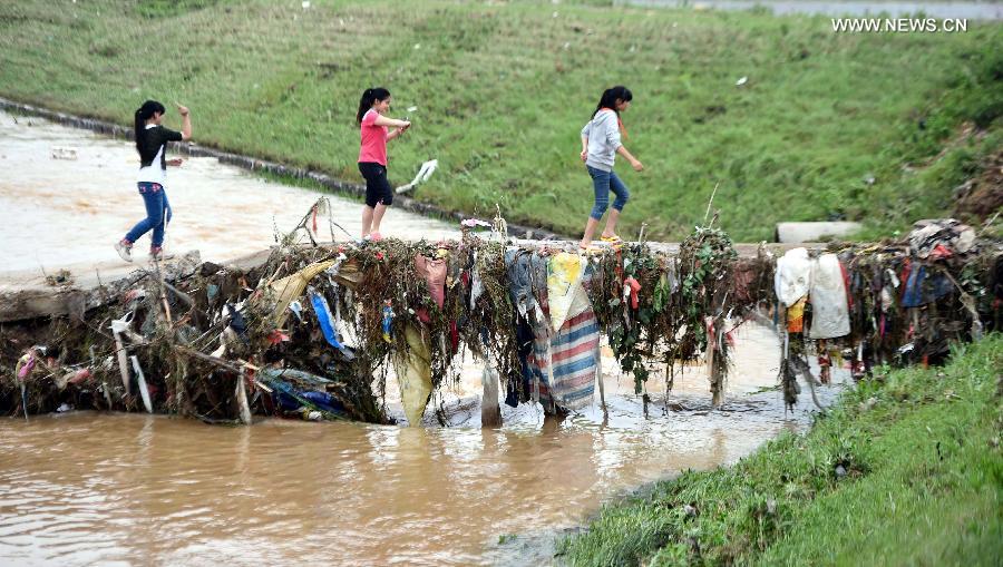 Garbage washed away by the flood are seen stuck on a bridge in Chenjiafang Town, Shaoyang County, central China's Hunan Province, May 26, 2014. Hunan issued the red alert of floods on May 25 as continuous downpours hit many parts of the province. A total of 400,000 people were affected and 16,776 displaced with the collapse of 520 houses. (Xinhua/Li Ga) |