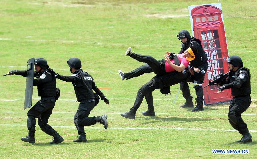 Policemen capture a 'terrorist' at an anti-terrorism drill in Shaoxing, east China's Zhejiang Province, May 27, 2014. Police of Zhejiang Province held an anti-terror drill on Tuesday.(Xinhua/Wang Dingchang)