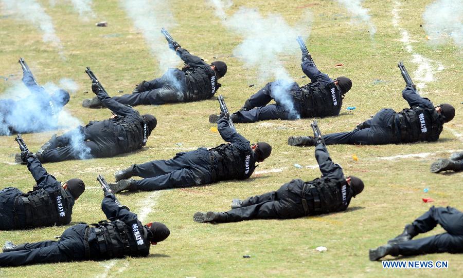 Policemen show fighting skills during an anti-terrorism drill in Shaoxing, east China's Zhejiang Province, May 27, 2014. Police of Zhejiang Province held an anti-terror drill on Tuesday.(Xinhua/Wang Dingchang)