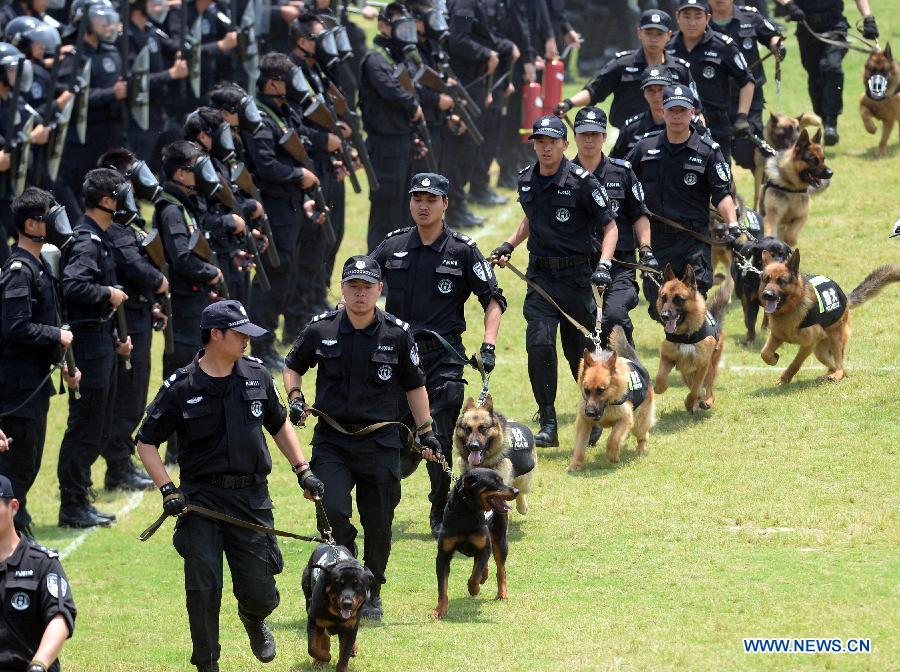 Policemen and police dogs attend an anti-terrorism drill in Shaoxing, east China's Zhejiang Province, May 27, 2014. Police of Zhejiang Province held an anti-terror drill on Tuesday.(Xinhua/Wang Dingchang)