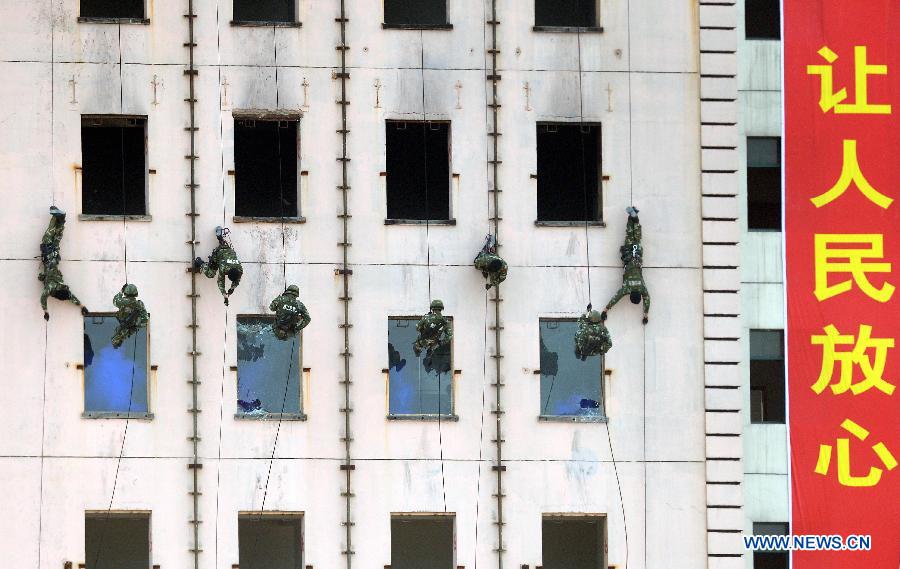 Policemen show fighting skills during an anti-terrorism drill in Shaoxing, east China's Zhejiang Province, May 27, 2014. Police of Zhejiang Province held an anti-terror drill on Tuesday.(Xinhua/Wang Dingchang)