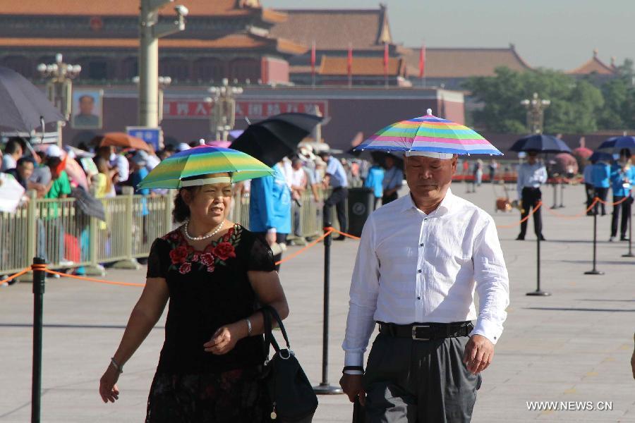 People visit the Tian'anmen Square with sunshades in Beijing, capital of China, May 28, 2014. The city's meteorological department issued this year's first yellow alert for heat Tuesday. (Xinhua/Wang Yueling)
