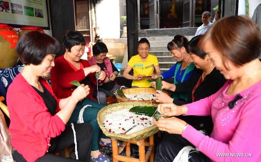 Women make Zongzi, a pyramid-shaped dumpling made of glutinous rice wrapped in bamboo or reed leaves, ahead of the Dragon Boat Festival in Zigui County of Yichang City, central China's Hubei Province, May 28, 2014. The Dragon Boat Festival, which falls on June 2 this year, is believed to be designed to commemorate the death of Qu Yuan, a patriot poet during the Warring State Period (475-221 BC). As the festival approaches, people in Zigui County, hometown of Qu Yuan, have prepared various activities including hanging mugwort leaves, holding dragon boat races and making Zongzi for celebrations. (Xinhua/Zheng Jiayu)