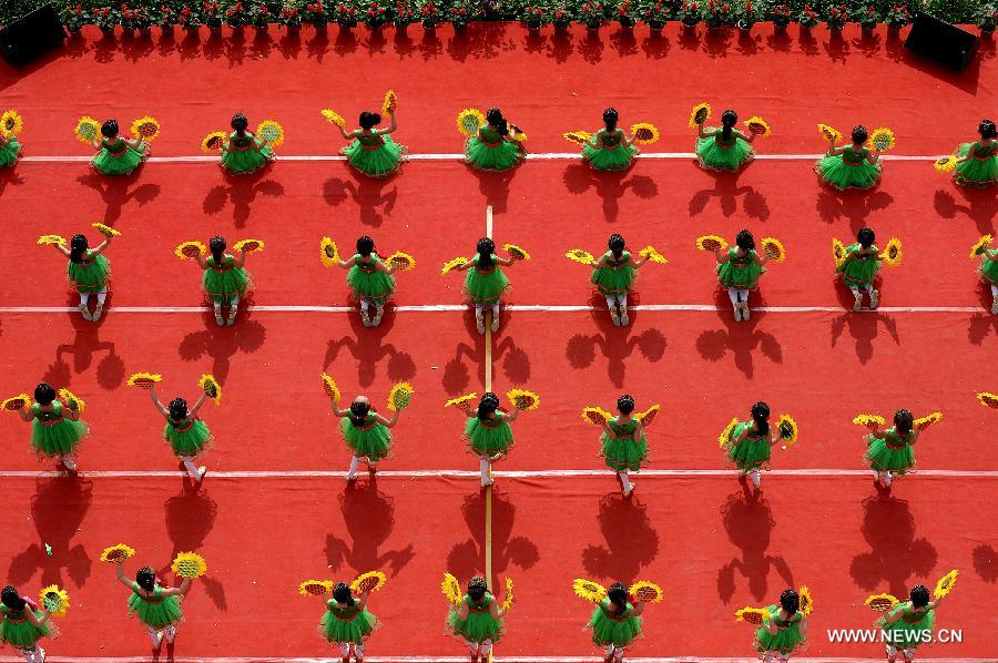 Pupils dance to celebrate the upcoming Children's Day in Xuan'en County, central China's Hubei Province, May 28, 2014. (Xinhua)