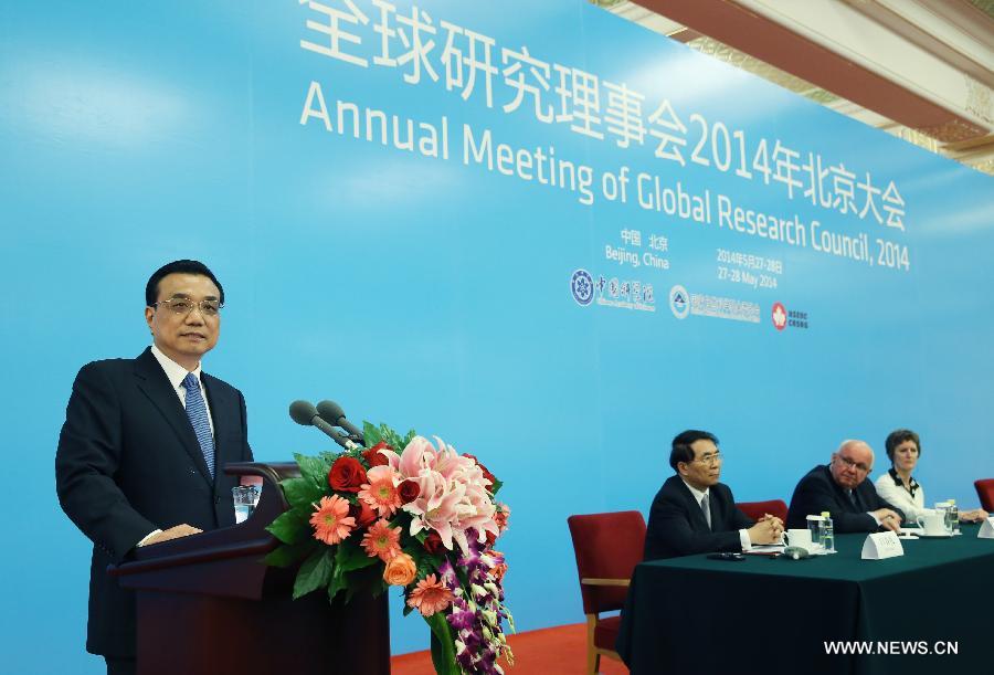 Chinese Premier Li Keqiang (1st L) addresses the opening ceremony of the Annual Meeting of the Global Research Council in Beijing, capital of China, May 27, 2014. (Xinhua/Yao Dawei)