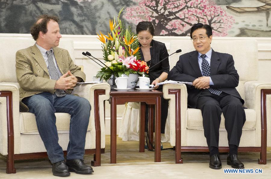 Zhao Hongzhu (R), member of the Secretariat of the Communist Party of China (CPC) Central Committee, meets with a visiting delegation of cadres of Chile's ruling coalition, in Beijing, China, May 27, 2014. (Xinhua/Huang Jingwen) |