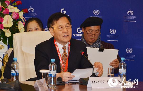Zhang Jing’an, academician of International Eurasian Academy of Science and director general of China Association of High Tech Zones, delivers a speech at the conference on the Silk Road Economic Belt, a sub-forum of the VII Astana Economic Forum which took place on May 21, 2014. (People’s Daily Online/ Yao Chun)
