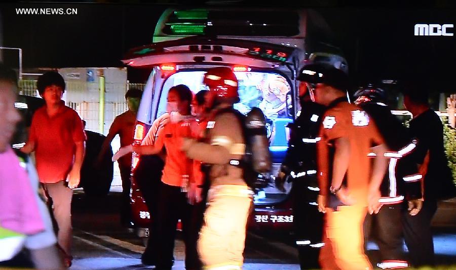 Photo released by Newsis shows policemen carrying the injured to a hospital in southern South Korea, early morning on May 28, 2014 (local time). Twenty-one people were killed and seven others injured in a fire at a hospital in southern South Korea early Wednesday. (Xinhua/Newsis) |