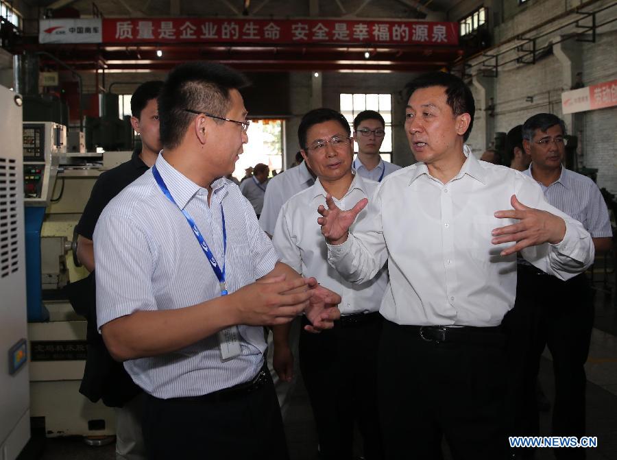 Chinese state councilor Wang Yong visits China South Locomotive and Rolling Stock Corporation Ltd. (CSR) in Beijing, capital of China, May 29, 2014. Wang made an inspection tour to some central enterprises in Beijing on May 27 and 29. (Xinhua/Liu Weibing) |