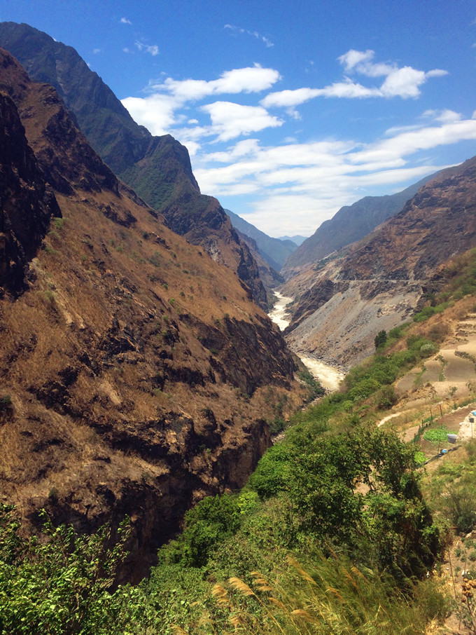 Photo taken on May 24, 2014 shows the amazing scenery in Hutiao Gorge. Hutiao Gorge is located in the upper reaches of the Jinsha River, to the northeast of Lijiang, in southwest China's Yunnan Province. The narrowest stretch in the river is only about 30 meters across. According to a legend, a tiger failed to jump across the river at that point. The river is about 29 kilometers long, reaching 3,790 meters in depth between Jade Dragon and Haba Snow Mountains, creating one of the most spectacular deep gorges in the world.(People's Daily Online/Huang Jin)