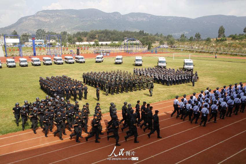 With over 100 representatives from political, business, education and other fields as audience, Public Security Bureau of Kunming held an actual combat exercise in Kunming, capital city of southwest China's Yunnan province, May 27, 2014.