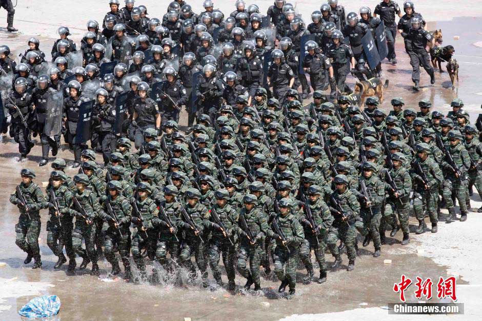 An anti-terrorism and riot comprehensive exercise is held in Beijing on Thursday. Special forces, fire and rescue departments jointly took part in the drill. The police are set to start a year-long nationwide anti-terrorism operation after attacks took place in Xinjiang and several cities across China, according to Xinhua News Agency. (CNS Photo) |