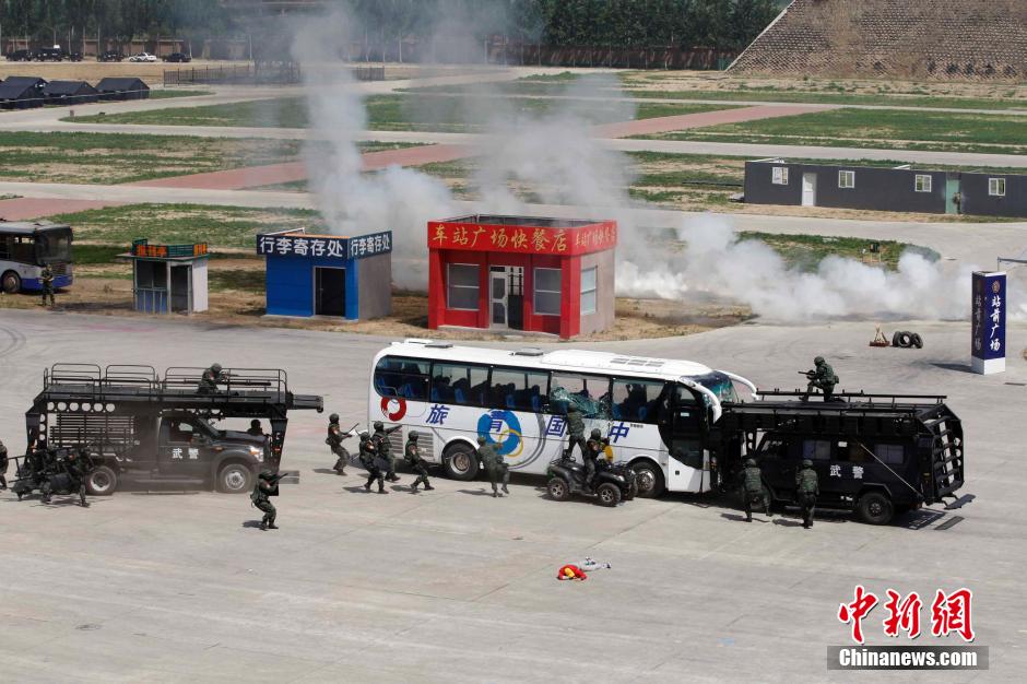An anti-terrorism and riot comprehensive exercise is held in Beijing on Thursday. Special forces, fire and rescue departments jointly took part in the drill. The police are set to start a year-long nationwide anti-terrorism operation after attacks took place in Xinjiang and several cities across China, according to Xinhua News Agency. (CNS Photo)