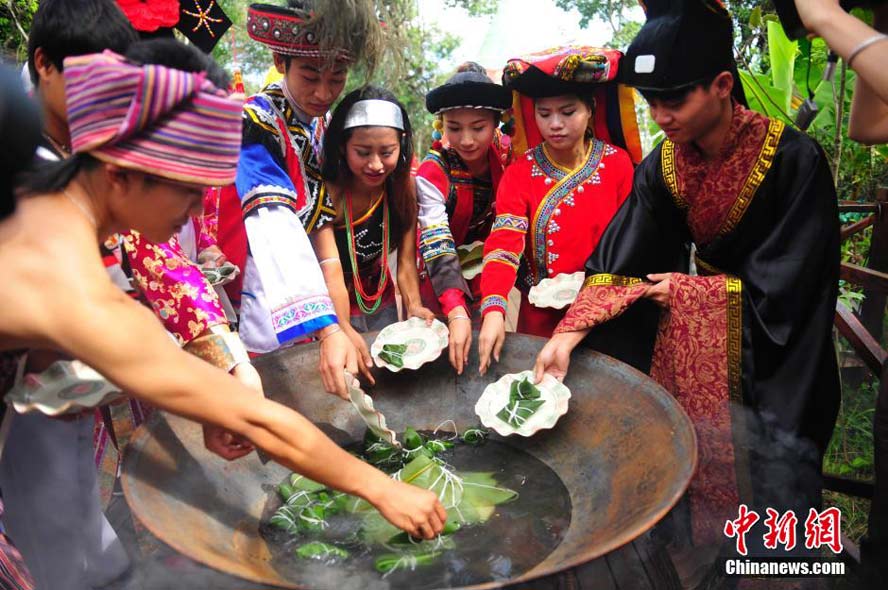 People of 26 ethnic groups in festival dresses make rice dumplings together to greet the Dragon Boat Festival at the Taiyanghe National Forest Park in Pu’er, south China’s Yunnan province. (China News Service/Liu Ranyang)