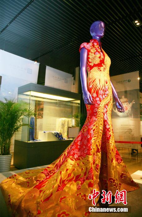 The "Golden Chi-pao", which worth about a million yuan, was presented in E China's Hangzhou, on May 30, 2014. (Photo source:chinanews.com)