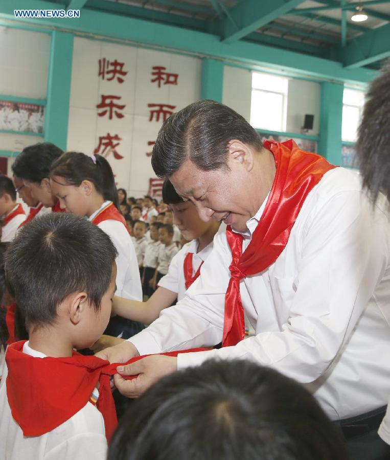 Chinese President Xi Jinping attends an initiation ceremony of Young Pioneers during his visit at Beijing Haidian National Primary School in Beijing, capital of China, May 30, 2014. Xi attended an activity to celebrate the upcoming International Children's Day at the primary school. (Xinhua/Ju Peng) |