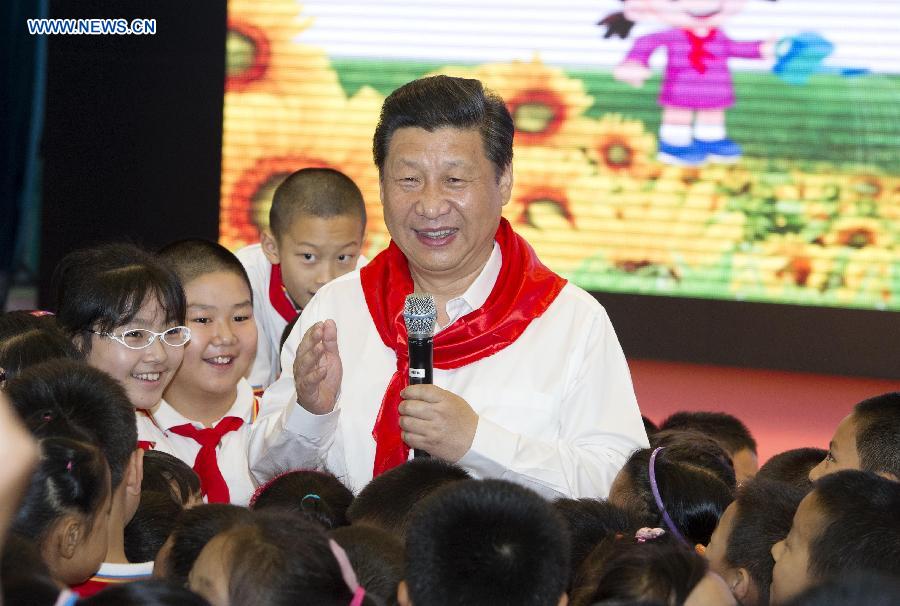 Chinese President Xi Jinping attends an initiation ceremony of Young Pioneers during his visit at Beijing Haidian National Primary School in Beijing, capital of China, May 30, 2014. Xi attended an activity to celebrate the upcoming International Children's Day at the primary school. (Xinhua/Xie Huanchi) |