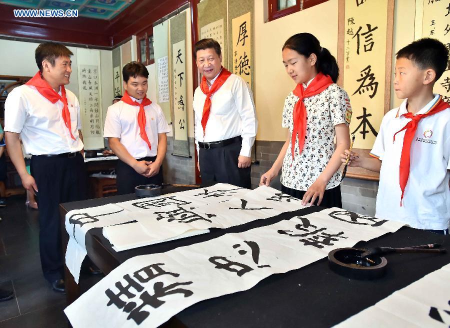 Chinese President Xi Jinping views pupils' calligraphy works during his visit at Beijing Haidian National Primary School in Beijing, capital of China, May 30, 2014. Xi attended an activity to celebrate the upcoming International Children's Day at the primary school. (Xinhua/Li Tao)