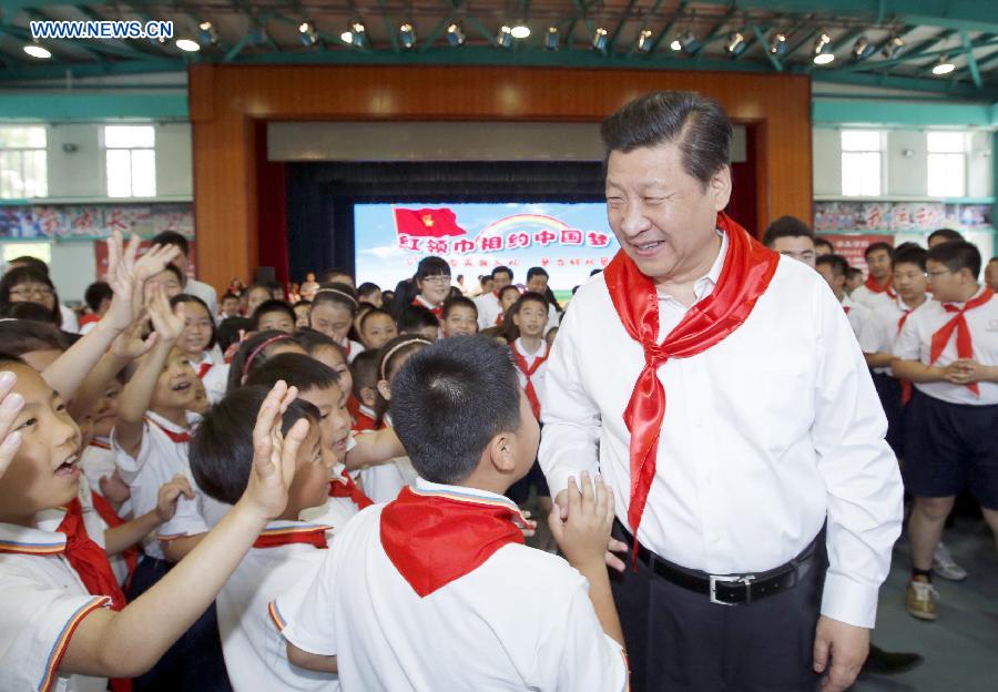 Chinese President Xi Jinping attends an initiation ceremony of Young Pioneers during his visit at Beijing Haidian National Primary School in Beijing, capital of China, May 30, 2014. Xi attended an activity to celebrate the upcoming International Children's Day at the primary school. (Xinhua/Ju Peng) |