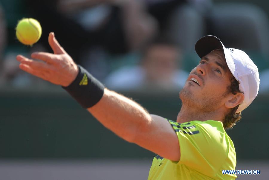 Andy Murray of Britain serves during the men's singles third round match against Germany's Philipp Kohlschreiber at the French Open in Paris, France, on May 31, 2014. The match was suspended in the fifth set for the onset of darkness. (Xinhua/Chen Xiaowei) |