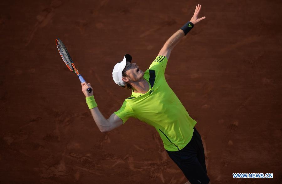 Andy Murray of Britain serves during the men's singles third round match against Germany's Philipp Kohlschreiber at the French Open in Paris, France, on May 31, 2014. The match was suspended in the fifth set for the onset of darkness. (Xinhua/Chen Xiaowei)