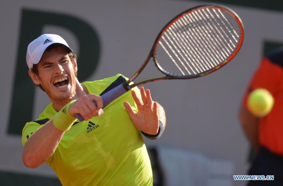 Andy Murray of Britain returns a shot during the men's singles third round match against Germany's Philipp Kohlschreiber at the French Open in Paris, France, on May 31, 2014. The match was suspended in the fifth set for the onset of darkness. (Xinhua/Chen Xiaowei) |