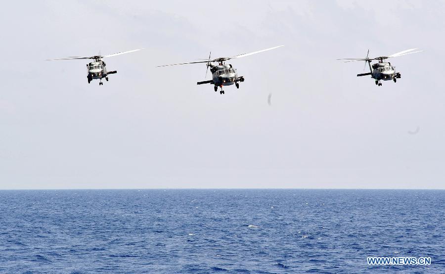 Three helicopters fly in a military drill in the Mediterranean Sea in Turkey, on May 31, 2014. Turkish Naval Forces launched a large-scale and wide-range military drill with the code name of White Storm-2014 in southwestern province of Antalya's Mediterranean Sea district. The training process will continue until June 1. (Xinhua/Cihan) |