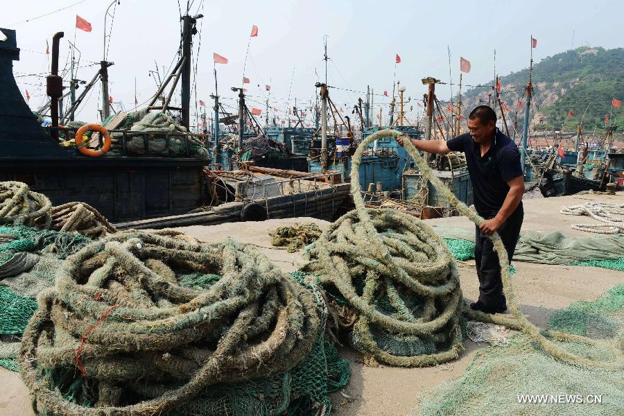 A fisherman arranges fishing net in Qingdao, east China's Shandong Province, May 31, 2014. The three-month-long fishing off season of the Bohai Sea, the Yellow Sea and East China Sea would start on June 1. (Xinhua/Yu Fangping)