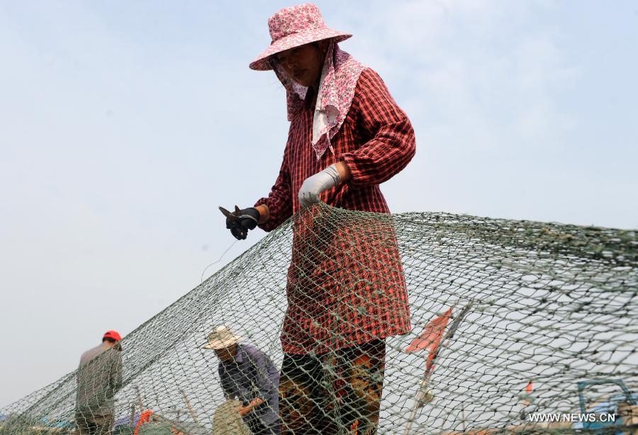 A fisherman mends a fishing net in Lianyungang, east China's Jiangsu Province, May 31, 2014. The three-month-long fishing off season of the Bohai Sea, the Yellow Sea and East China Sea would start on June 1. (Xinhua/Geng Yuhe)