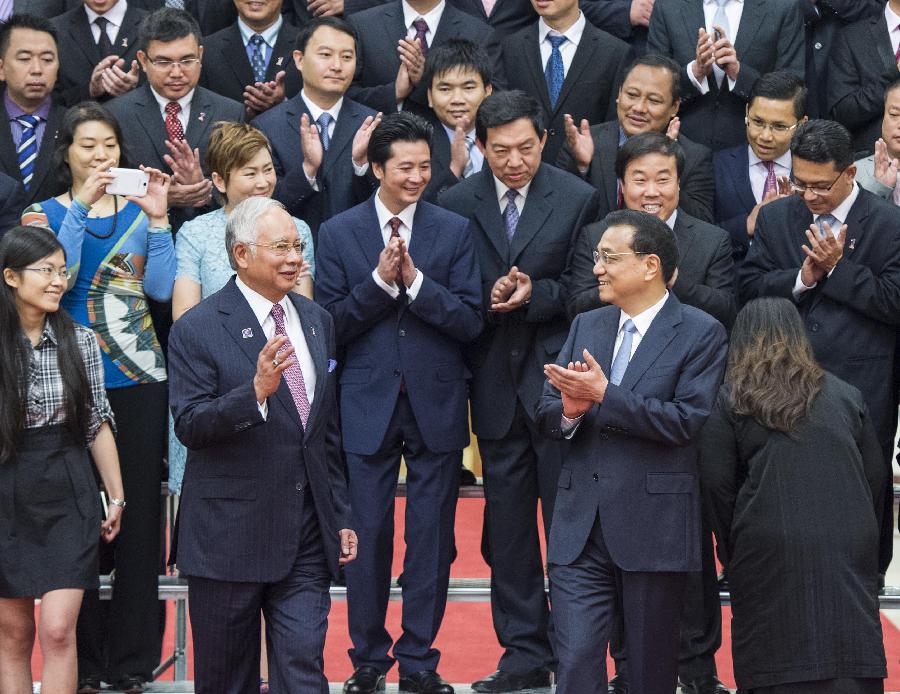 Chinese Premier Li Keqiang (2nd R front) and Malaysian Prime Minister Najib Razak (2nd L front) meet with representatives of youth from both China and Malaysia before the celebration of the 40th anniversary of the establishment of diplomatic relations between China and Malaysia in Beijing, capital of China, May 31, 2014. (Xinhua/Wang Ye) |