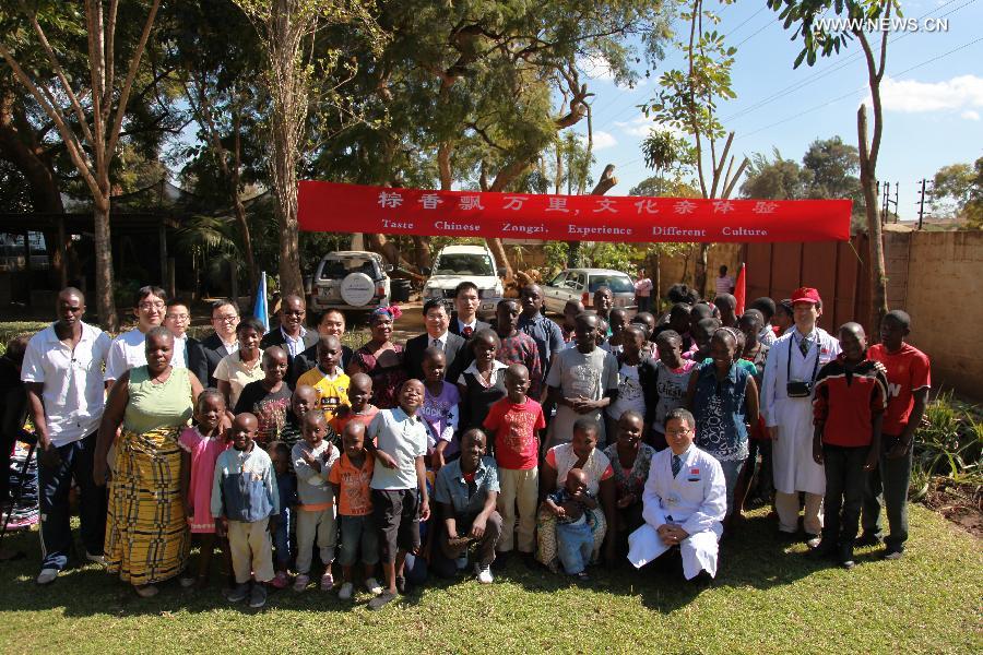 The children and representatives of Chinese organizations pose for group photos at Kabwata Orphanage in Lusaka, capital of Zambia, May 31, 2014. Three Chinese organizations -- Sino-Hydro Zambia Limited, Confucius Institute and Chinese medical team -- donated goods to the orphanage, which has about 50 children from 11 months to 18 years old. (Xinhua/Peng Lijun)