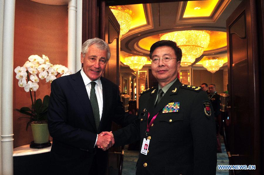 Wang Guanzhong (R), deputy chief of the General Staff of the People's Liberation Army (PLA), meets with U.S. Defense Secretary Chuck Hagel in the ongoing Shangri-La Dialogue in Singapore, May 31, 2014. The establishment of a new model of China-U.S. relations requires the two countries to respect each other and treat each other as equals, Wang Guanzhong said here Saturday. (Xinhua/Then Chih Wey) |
