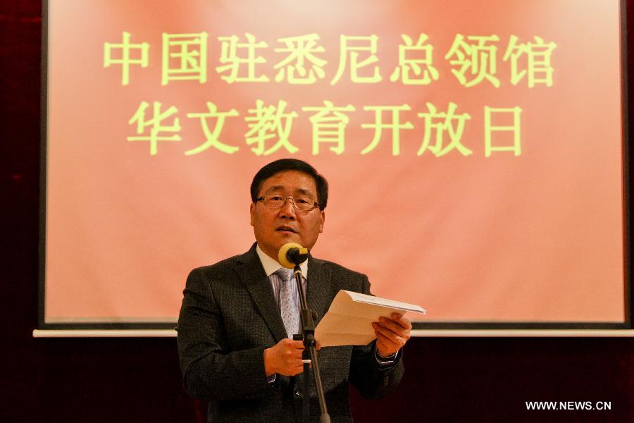Chinese Consul General in Sydney Li Huaxin delivers a speech during the "Open Day Event of Chinese Language Education" at the Chinese consulate general in Sydney, Australia, June 1, 2014. Teachers and students of local Chinese language schools were invited to the event in celebration of International Children's Day. (Xinhua/Jin Linpeng) |