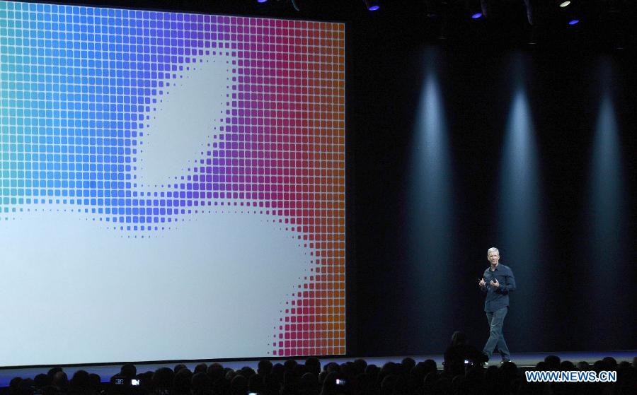 Apple's Chief Executive Tim Cook is seen on the company's World Wide Developers Conference (WWDC2014) in San Francisco, the United States, June 2, 2014. Apple kicked off its developers conference on Monday. (Xinhua)