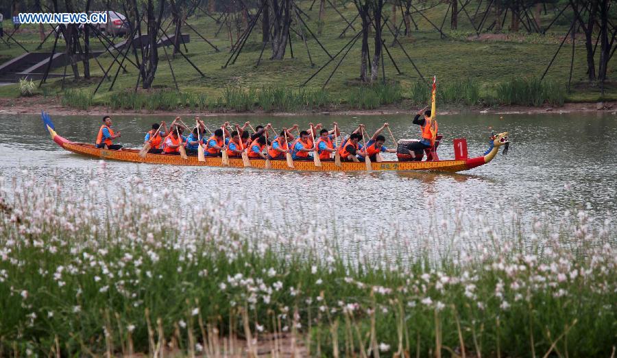 Competitors row on a dragon boat during a race on the Qinhuang River to celebrate the Dragon Boat Festival in Binzhou, east China's Shandong Province, June 2, 2014. The Dragon Boat Festival, also known as Duanwu, is celebrated annually on the fifth day of the fifth month of the Chinese lunar calendar, which falls on June 2 this year. (Xinhua/Zhang Binbin)