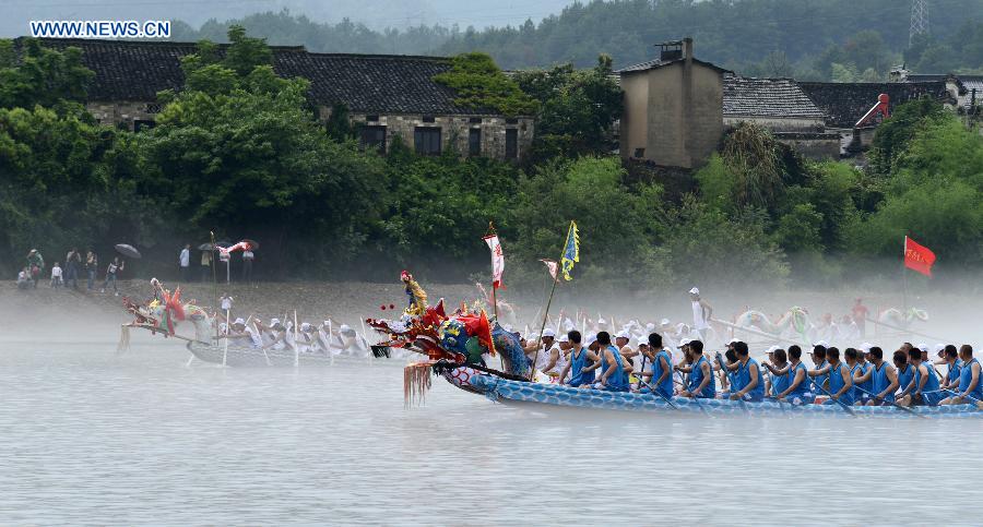 Competitors row on a dragon boat during a race on the Qinhuang River to celebrate the Dragon Boat Festival in Binzhou, east China's Shandong Province, June 2, 2014. The Dragon Boat Festival, also known as Duanwu, is celebrated annually on the fifth day of the fifth month of the Chinese lunar calendar, which falls on June 2 this year. (Xinhua/Zhang Binbin)