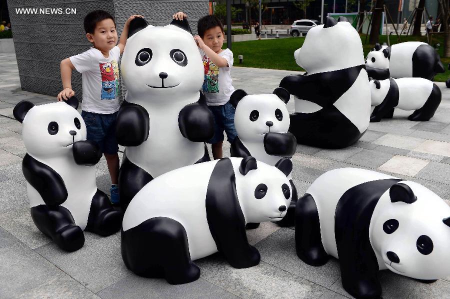 Children pose for photos with lovely "pandas" during the "1St panda" exhibition at Kerry Center Square in Shanghai, east China, June 2, 2014. A total of 100 pandas made of leftover moso bamboos were displayed during the exhibition. (Xinhua/Lai Xinlin) |