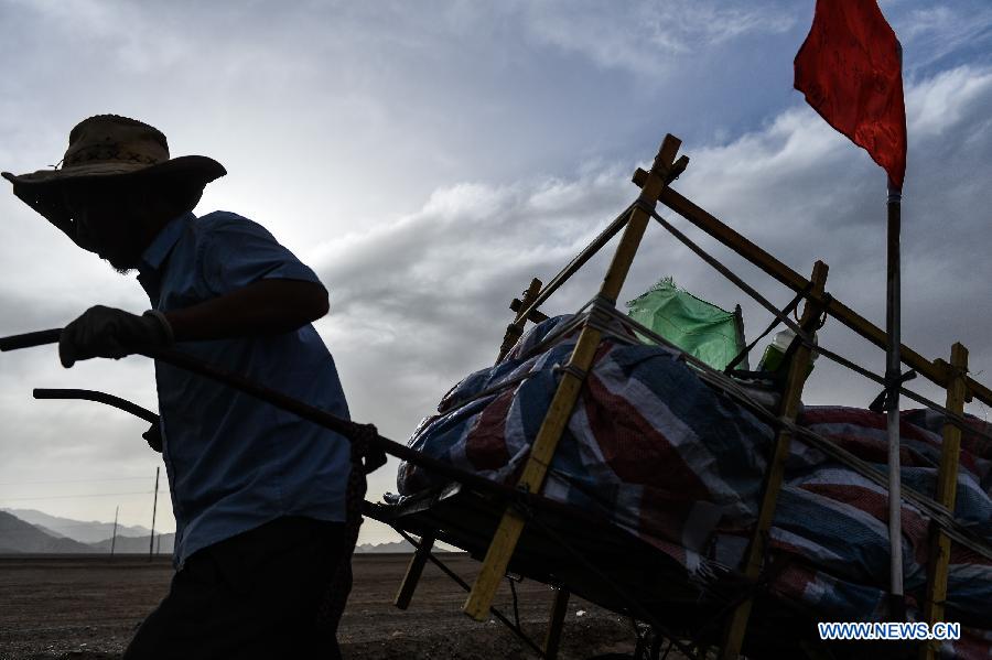 Li Zongtao walks on the Qinghai-Tibet Highway, Northwest China's Qinghai province, May 30, 2014. [Photo/Xinhua]
