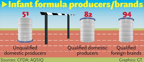 The entry bar for baby formula imports was also raised. China's General Administration of Quality Supervision, Inspection and Quarantine (AQSIQ) on Thursday announced a list of 94 baby formula brands that are qualified for imports.