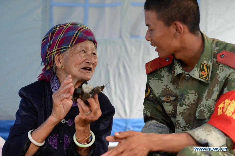 An armed police officer gives a Zongzi, a glutinous rice dumpling, to an old lady as they celebrate the Dragon Boat Festival at a makeshift settlement in the earthquake-afflicted Hanxinlang Village under Kachang Town of Yingjiang County, Dehong Dai and Jingpo Autonomous Prefecture, southwest China's Yunnan Province, June 2, 2014. Yingjiang County was hit by a 6.1-magnitude earthquake on May 30 and a 5.6-magnitude one on May 24. The Dragon Boat Festival, also known as Duanwu, is celebrated annually on the fifth day of the fifth month of the Chinese lunar calendar, which falls on June 2 this year. (Xinhua/Hu Chao) |