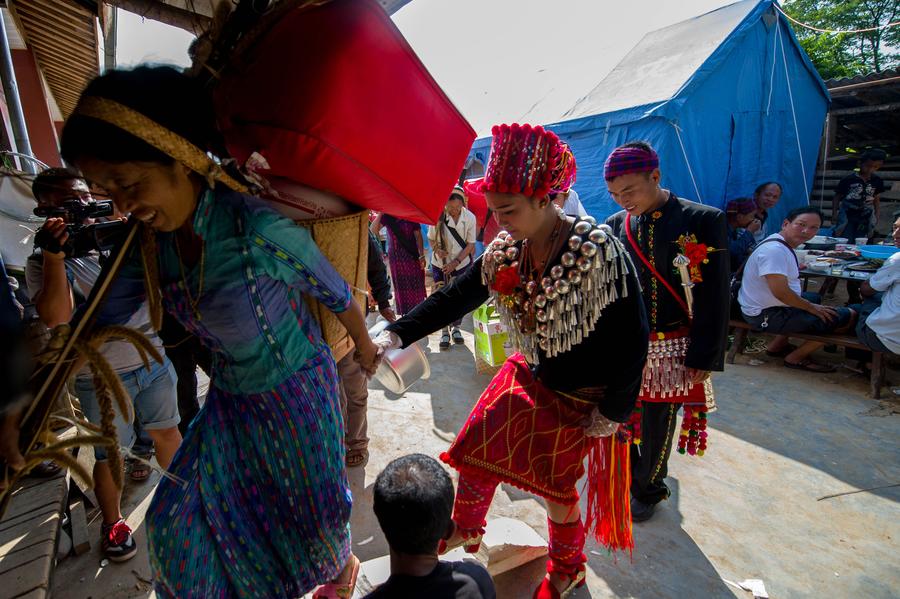The couple is greeted by well wishers as they enter the makeshift wedding venue, June 1, 2014. (Photo/Xinhua)