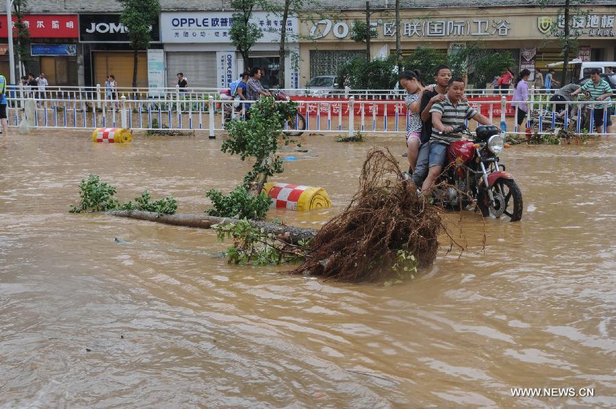 A man drives through a waterlogged road in Pingba County of Anshun city, southwest China's Guizhou province, June 3, 2014. Heavy rain has battered most areas of Guizhou since Monday. (Xinhua/Ou Dongqu)