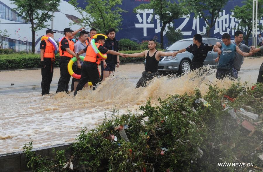 Rescuers work on a waterlogged road in Pingba County of Anshun city, southwest China's Guizhou province, June 3, 2014. Heavy rain has battered most areas of Guizhou since Monday. (Xinhua/Ou Dongqu)