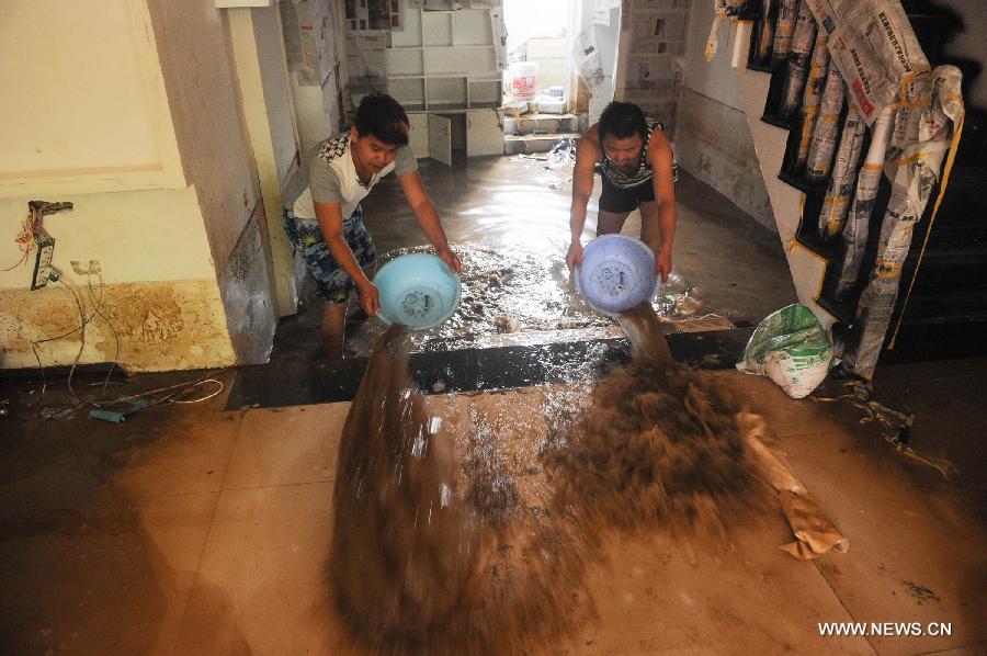 People drain water out of a flooded building in Pingba County of Anshun city, southwest China's Guizhou province, June 3, 2014. Heavy rain has battered most areas of Guizhou since Monday. (Xinhua/Ou Dongqu)