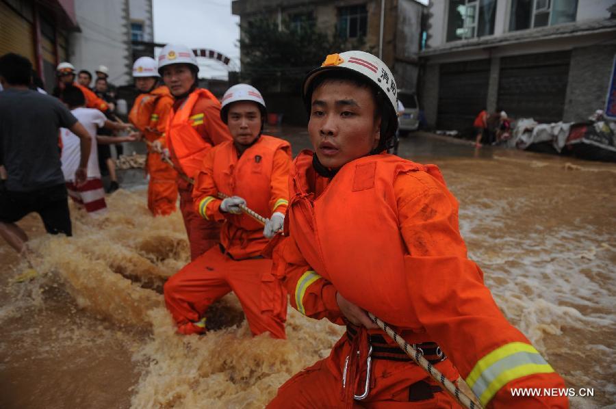 Rescuers work on a waterlogged road in Pingba County of Anshun city, southwest China's Guizhou province, June 3, 2014. Heavy rain has battered most areas of Guizhou since Monday. (Xinhua/Ou Dongqu)