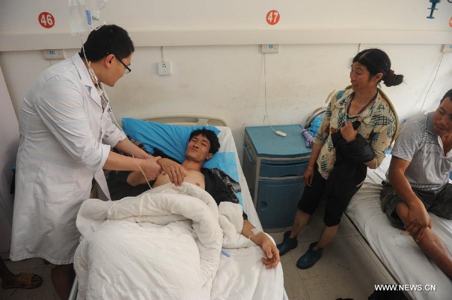A man injured in storms receives treatment at a hospital in Pingba County of Anshun city, southwest China's Guizhou province, June 3, 2014. Heavy rain has battered most areas of Guizhou since Monday. (Xinhua/Ou Dongqu)