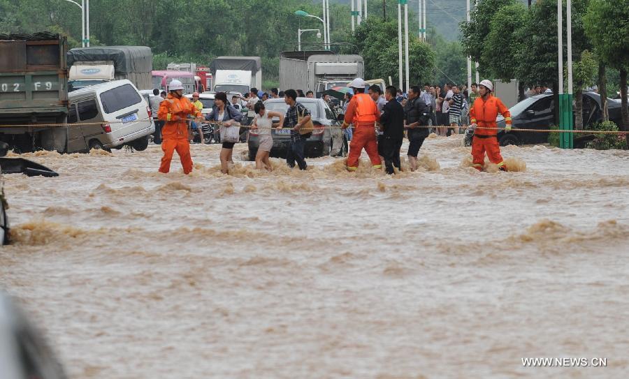 People wade across a waterlogged road in Pingba County of Anshun city, southwest China's Guizhou province, June 3, 2014. Heavy rain has battered most areas of Guizhou since Monday. (Xinhua/Ou Dongqu)
